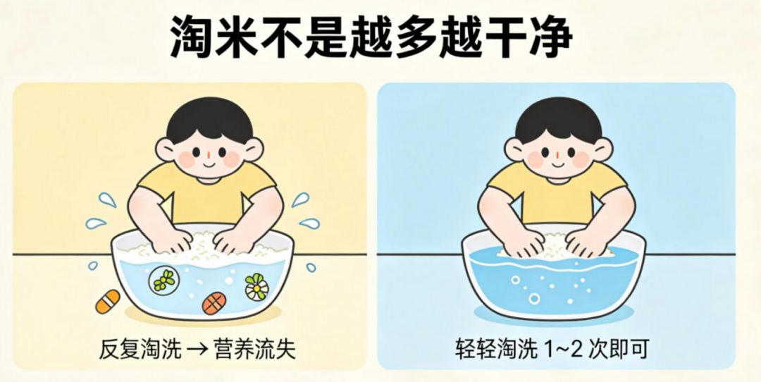 因此,淘米不是越多越好。一般建议轻轻淘洗1~2次即可,不必用流水长时间冲洗,更不要用力揉搓或用热水烫洗。这样既能去除表面的少量粉尘,也能尽量减少营养流失。